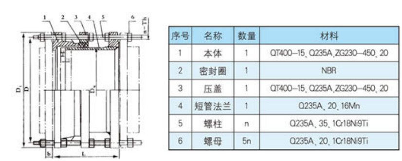 可拆卸接頭是由本體、密封圈、壓蓋、伸縮短管等主要部件組成。適用于兩邊均與法蘭連接的管道中,安裝時調節產品兩端與法蘭的安裝長度,對角集資均勻擰緊壓蓋螺栓,使其成為以整體,并有一定的位移量,方便安裝維修時,根據現場尺寸進行調整。在工作時可以反軸向推力傳遞至整個管道。優點:安裝簡單方便、方便閥門安裝。在法蘭松套補償接頭的基礎上增設法蘭短管及傳力螺桿而成,次類型的補償接頭與松套補償接頭和松套限位補償接頭不同的是它的補償量是指在安裝及拆卸過程中的調節量,一旦將所有的螺母擰緊,它是剛性連接的,可以傳遞軸心力,從而保護閥門、泵等設備。